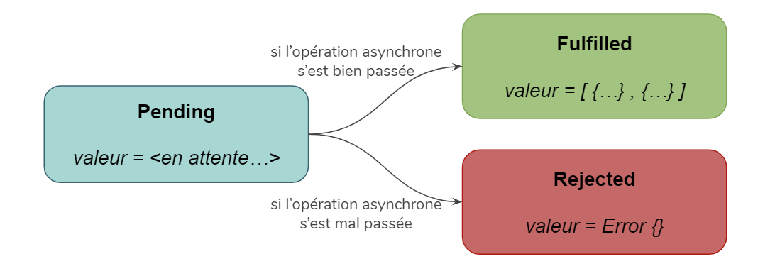 Un objet "Promise" met à disposition 2 méthodes : .then() et .catch(), respectivement pour gérer une opération réussie et une opération échouée.